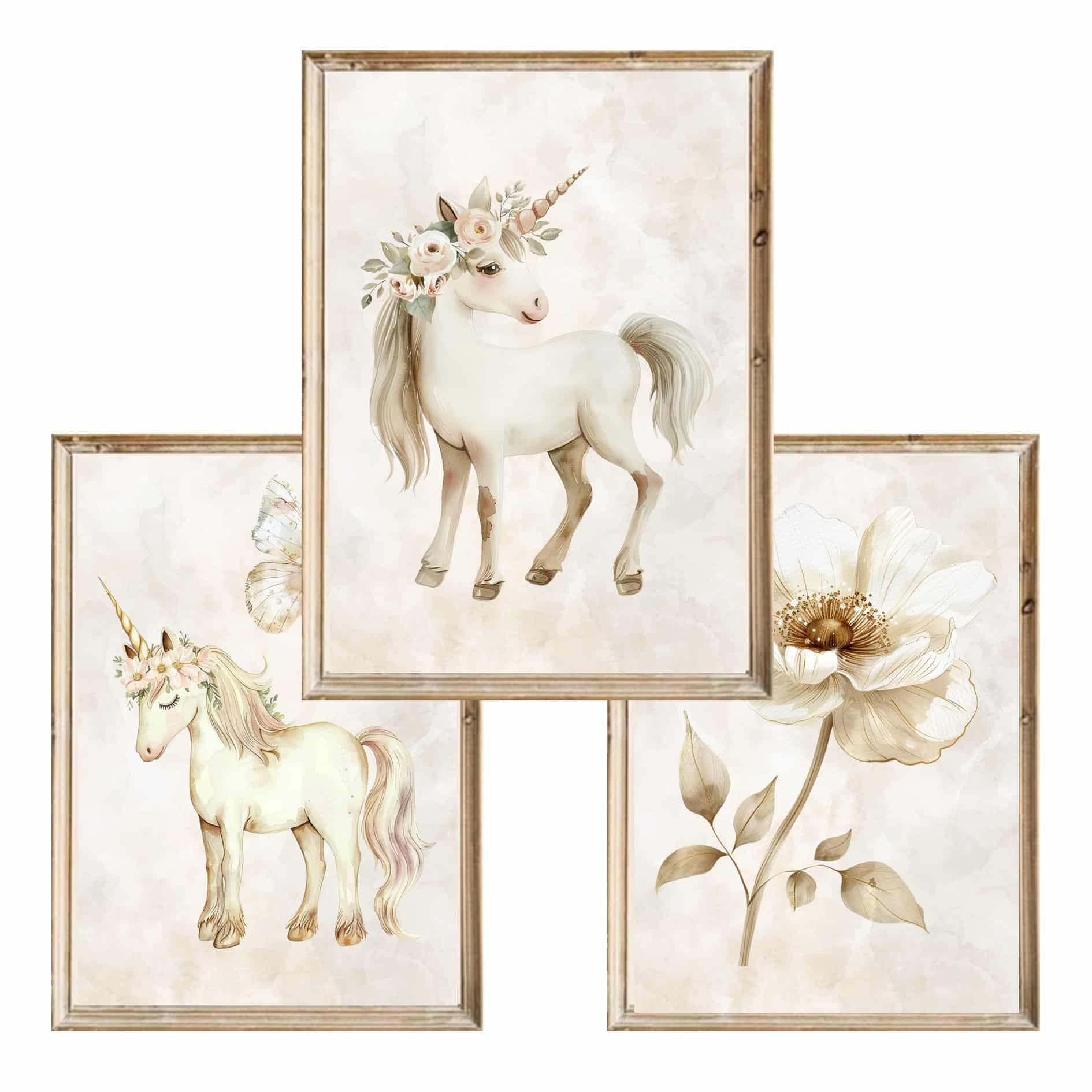 Zestaw trzech plakatów dla dzieci Beżowe Jednorożce